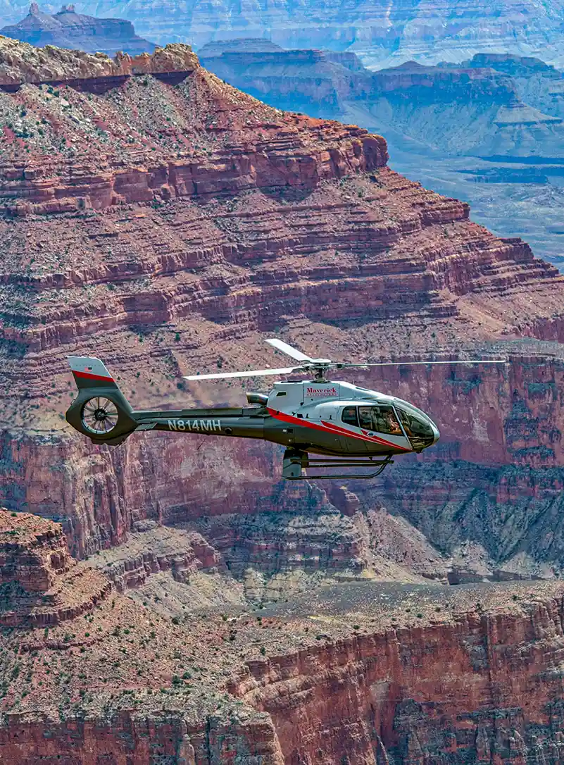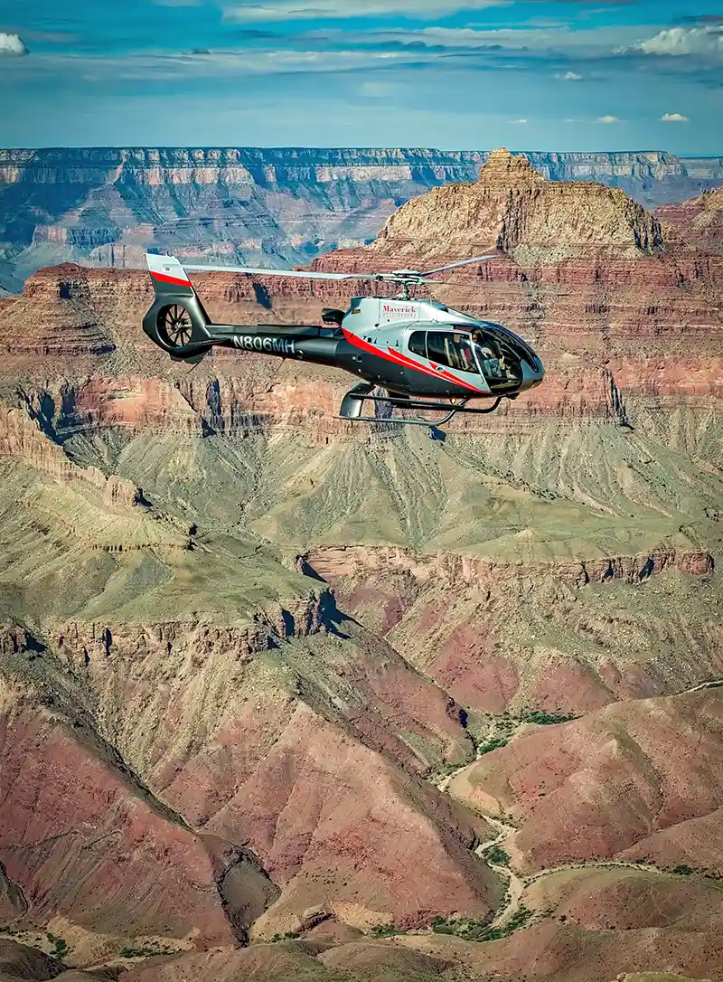 Your journey includes a breathtaking helicopter flight for a 45-minute aerial tour over the Grand Canyon. Your flight will include views of the Kaibab National Forest, the North Rim, and eastern end of the canyon. You will follow the Colorado River upstream to where it merges with the Little Colorado River, enjoying views of the Painted Desert and Desert View Watchtower in the distance. See Marble Canyon and Point Imperial as you climb above the North Rim, head south through the Dragon Corridor (the deepest, widest point in the canyon), and then leave the Grand Canyon, flying over the South Rim back to the airport.